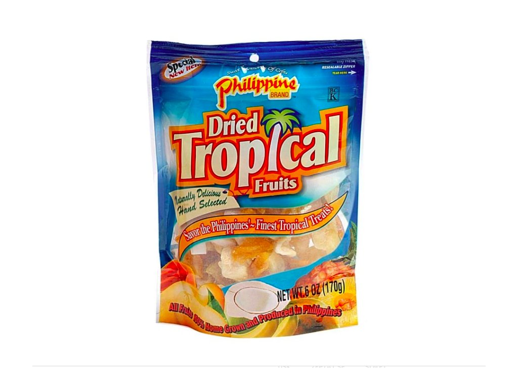 CZ Složení: mango, ananas, banán, papája, kokos, cukr, konzervant: disiřičitan sodný. Uchovejte v suchu a chladu.